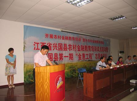 启动仪式结束后,人行南昌中支金融研究处何建军副处长为兴国县农村金融教育志愿者首期培训班进行了授课,授课的内容主要介绍了"金惠工程"效果评估指标体系构成和其它省开展农村金融教育培训试点成果、经验。